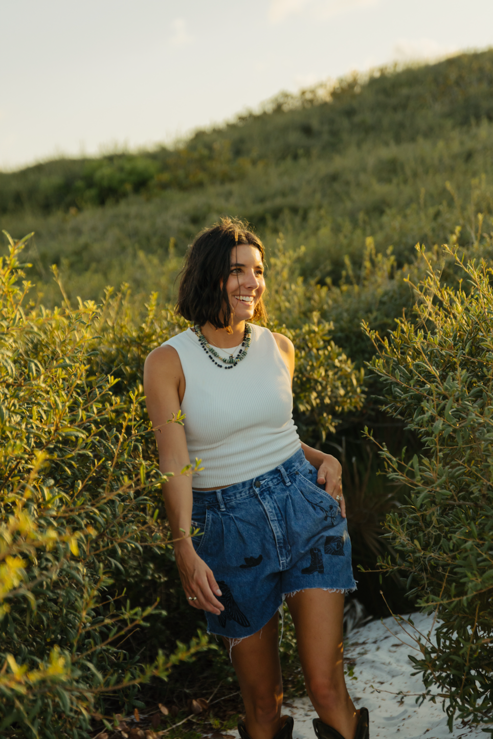 Every necklace is hand-beaded using beads that are water-resistant. However, please note that the metal hardware may tarnish or change over time if exposed to water. To preserve its finish, we recommend removing your jewelry before swimming or showering.